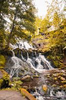 Kleine waterval in Zweden. Mos op stenen. Bos aan de oever. Scandinavische natuur