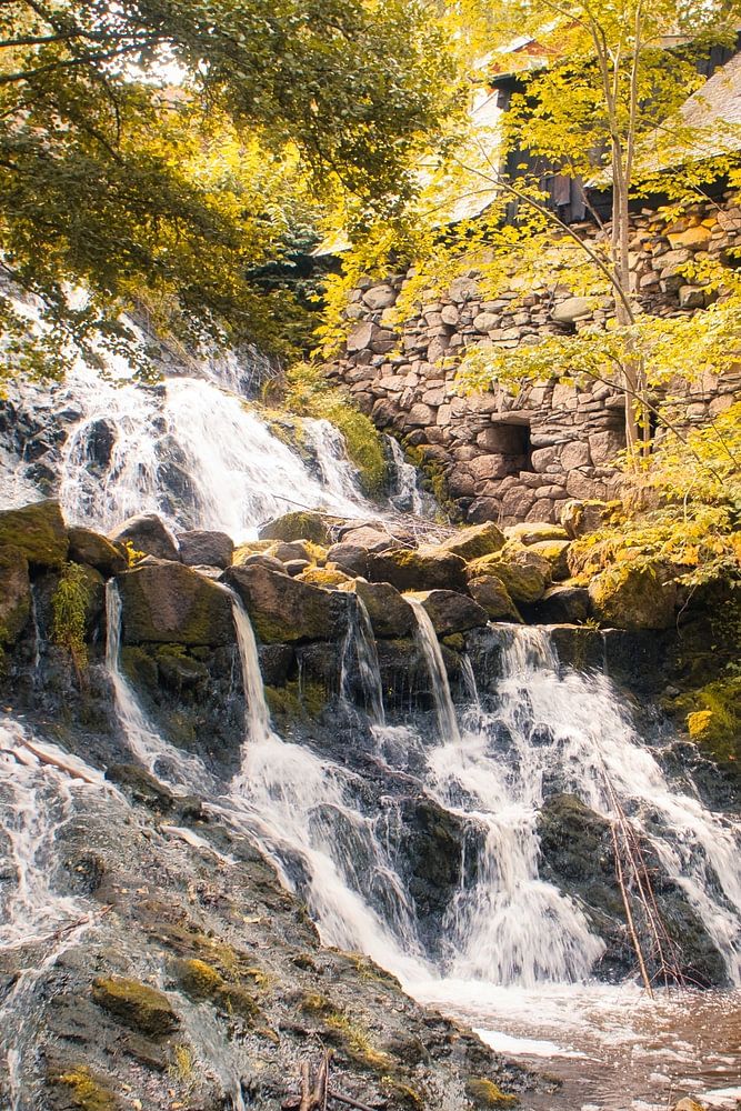 Kleine waterval in Zweden. Mos op stenen. Bos aan de oever. Scandinavische natuur