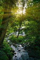 Kleine waterval in Zweden. Mos op stenen. Bos aan de oever. Scandinavische natuur