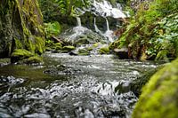 Kleine waterval in Zweden. Mos op stenen. Bos aan de oever. Scandinavische natuur