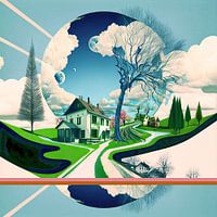Deze landschapscollage is opgebouwd uit losse onderdelen en samengevoegd tot een nieuwe werkelijkheid. Zo ontstaat er een zekere mate van vervreemding.