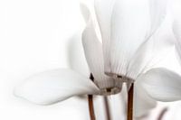 Deze high-key kleine witte cyclaampjes vormen tegen een witte achtergrond een fris, helder, rein accent in het interieur. De softe uitstraling geeft iets sprookjesachtig dromerigs.