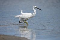 Kleine zilverreiger, lopend in het water opzoek naar voedsel op een zonnige dag.