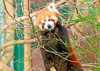 Buntes Poster eines kleinen roten Pandabären beim Fressen von Bambus