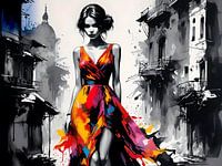 De stad, gedetailleerd en met zorg geschilderd, straalt een sombere sfeer uit met zijn kapotte gebouwen en verlaten straten. Het contrast tussen de grauwe omgeving en de felgekleurde jurk van de vrouw is adembenemend, en nodigt de toeschouwer uit om na te denken over de thema's van herstel en menselijke spirit. Elke penseelstreek in het zwart-witte gedeelte benadrukt de verlatenheid en de historische littekens van de stad, terwijl de vrolijke kleuren van het jurkje een boodschap van optimisme en nieuw begin uitdragen.
