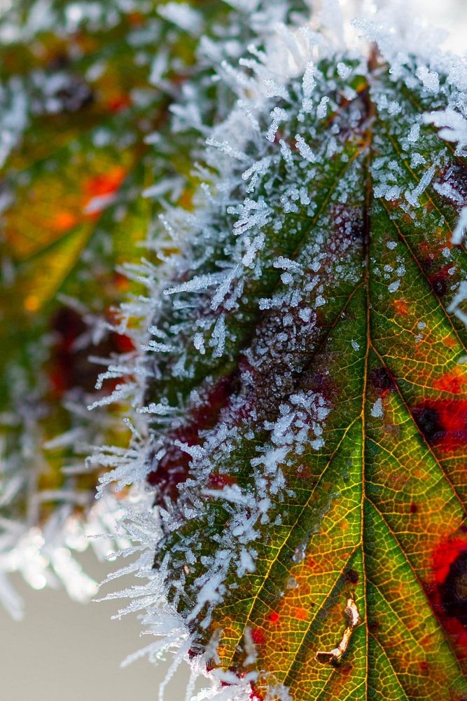Op een zeer koude ochtend, vormden deze blaadjes aan een bramenstruik een kleurrijk contrast met de wit-bevroren omgeving. In de Landjes, Marsdijk, Assen.