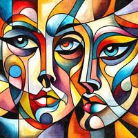 Twee gestileerde gezichten in kubistische stijl - een samenspel van geometrie, kleur en expressie. De gedurfde lijnen en levendige kleuren creëren een dynamische spanning tussen nabijheid en individualiteit.