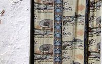 Kleurrijk gordijn met pauwen voor een oude deur in Andalusië.