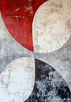 Kleurcontrast | Rode Cirkels - Dit abstracte schilderij kenmerkt zich door grote cirkelvormige vormen in rood, wit, zwart en grijs, die elkaar overlappen en een gevoel van rust en eenvoud uitstralen, ideaal om een kalme sfeer te creëren.