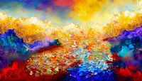 Dit digitale kunstwerk is een ware explosie van kleur en abstracte vormen. Het lijkt alsof je naar een verre ruimte kijkt, waar de oerknal net heeft plaatsgevonden en de kosmos zich nog aan het vormen is. Het geheel lijkt op een gigantische explosie. Er zijn talloze kleurrijke stralen en patronen te zien, die alle kanten op lijken te bewegen.