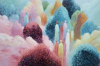 “Kleuren Wandel” verbeeldt een betoverend landschap waarin mensachtige figuren zich voortbewegen door een wereld die volledig lijkt opgebouwd uit kleur, licht en textuur. In plaats van realistische bomen of struiken zien we weelderige, zachte vormen opgebouwd uit duizenden kleine penseeltoetsen. Ze doen denken aan wolken van bladeren,…