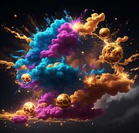 AI generated image of a purple ball exploding like a soap bubble .modern art in kleur en met gouden accenten.