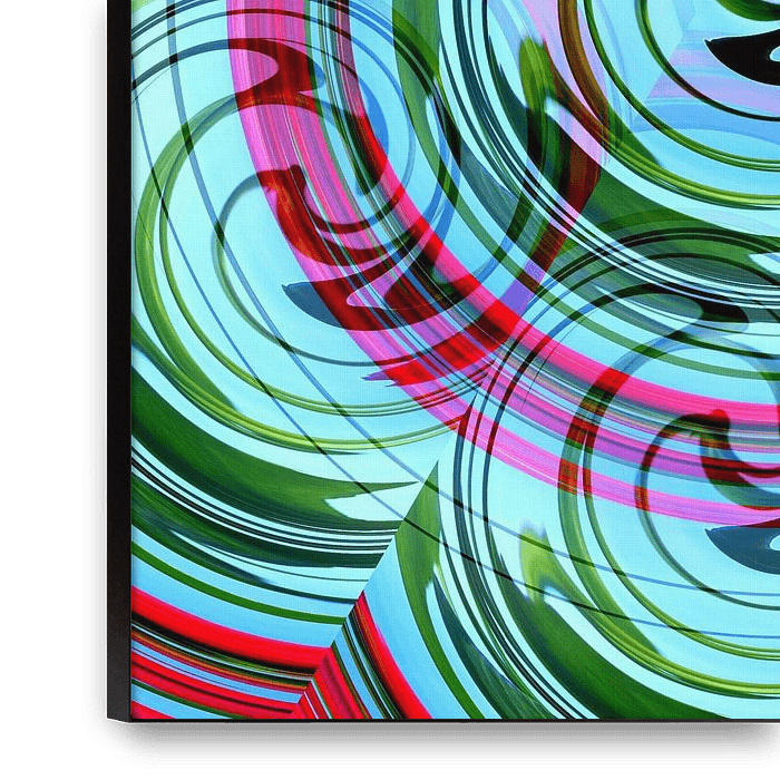 Dit abstracte werk draait om dynamiek en energie. De overlappende spiralen en vloeiende lijnen creëren een gevoel van voortdurende beweging, alsof de kleuren elkaar vooruit duwen. De combinatie van lichtblauw, rood, groen en roze geeft het geheel een levendige, bijna muzikale ritmiek. Het is een compositie die zowel speels als…