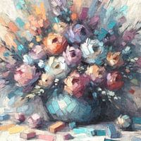 Een expressief boeket bloemen in felle en pasteltinten ontvouwt zijn energie in een turquoise gekleurd vat. De hoekige, dynamische penseelstreken geven het motief een modern, bijna kubistisch tintje, terwijl de zachte kleuren voor een harmonieus evenwicht zorgen. Pastelkrijt aan de rand van de afbeelding verwijst naar het creatieve…