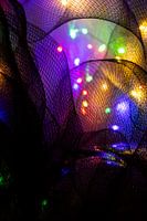 Deze foto toont een macro-opname van een fijnmazig draadraster dat zich in een zachte golfstructuur over het beeldoppervlak uitstrekt. De donkere, bijna zwarte draden vormen een regelmatig gaas dat wordt gekenmerkt door zijn geometrische helderheid. Op de achtergrond schijnen kleurrijke lichtpuntjes in blauw, groen, geel en rood door…