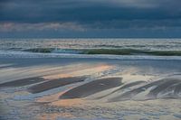Strand aan de Voordijk tussen Callantsoog en Groote Keeten tijdens de zonsondergang van 14 mei 2021. Kleuren van de ondergaande zon schijnen op het water.