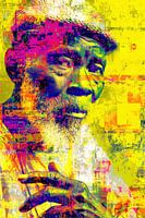 In dit portret zie je een oudere man met pet en baard, maar alles om hem heen lijkt te trillen van kleur. Felle neonlagen en glitch-achtige structuren geven het beeld een rauwe, bijna elektrische energie.