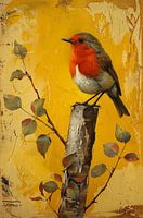 Een roodborstje zit op een tak tegen een zachte, gele achtergrond die warmte en licht uitstraalt. De combinatie van de felle borst en de zonnige gloed maakt dit werk vrolijk en uitnodigend. Dit werk maakt deel uit van de serie Kleuren van de roodborst, waarin de vogel in verschillende sferen wordt weergegeven.