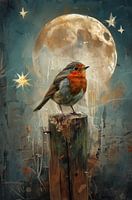 Een roodborstje komt naar voren tegen een donkere nachtelijke achtergrond. Het felle oranje borstje steekt krachtig af en geeft het werk een mystieke en rustige sfeer. Dit werk maakt deel uit van de serie Kleuren van de roodborst, waarin de vogel in verschillende sferen wordt weergegeven.