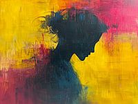 Het schilderij toont een vrouw in profiel, haar gezicht in donker weergegeven. Haar haar lijkt op te lossen in de wind, weergegeven in dynamische, golvende penseelstreken. De kunstenaar gebruikt krachtige primaire kleuren – rood en geel – die elkaar afwisselen in levendige contrasten. De achtergrond is abstract en beweeglijk, waardoor het geheel een gevoel van vrijheid, beweging en innerlijke kracht oproept.