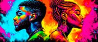 Dit betoverende schilderij toont twee gezichten die ruggelings tegenover elkaar staan, gehuld in een diep contemplatieve maar energieke stemming. De mannelijke en vrouwelijke figuren stralen in levendige kleuren en accentueren hun gezichten in helder blauw, oranje, roze en geel. De intense, levendige kleuren geven de indruk dat zowel de…