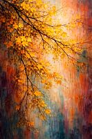 Dit prachtige kunstwerk legt de diepgaande schoonheid van de late herfst vast in een explosie van warme tinten. Heldere bladeren, rijk aan gouden en oranje nuances, sieren sierlijke takken die elegant naar beneden buigen. De achtergrond is een fascinerende mix van zachte aardetinten, warme oranje- en roodtinten en subtiele verwijzingen…