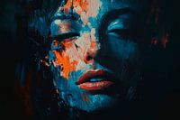 Hier ontvouwt zich een fascinerend samenspel van kleuren en texturen, terwijl de zachte contouren van een gezicht tijdelijk in elkaar overvloeien. De diepe blauwtinten worden afgewisseld met fel oranje, waardoor een sfeer van intensiteit en emotie ontstaat. Dit kunstwerk is ideaal voor een moderne woonkamer en brengt leven en emotie in elke kamer.