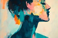 Een krachtig portret dat speelt met levendige kleurtonen inspireert de kijker. De harmonieuze combinatie van blauw, oranje en zachte pastelkleuren brengt een sfeer van rust en inspiratie. Perfect voor een woonkamer, creëert een stimulerende sfeer voor een gesprek en nodigt uit om te dromen.