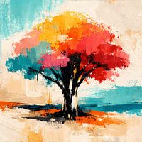 Een expressief, modern kunstwerk dat een krachtige boom toont met een diepzwarte stam en een stralende kruin. De kleurintensieve rode, oranje, gele en blauwe tinten versmelten in dynamische, gestructureerde penseelstreken tot een levendige, emotionele weergave van de natuur. De zachte achtergrond van beige, turquoise en witte nuances…