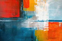 Kleurencontrast - Dit abstracte schilderij toont een dynamisch samenspel van levendige rode en oranje vlakken boven een kalme ondergrond met blauwe en witte tonen, waardoor een krachtige maar gebalanceerde visuele impact ontstaat.