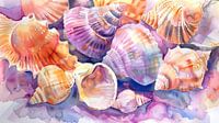 Dit rustgevende, levendige kunstwerk toont een verzameling schelpen in een rijke harmonie van kleuren, uitgevoerd in de waterverftechniek.