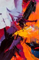 Een vurig kleurenspel ontvouwt zich als levendige oranje tinten hartstochtelijk botsen met diepe paarstinten en zwart. De vegen van de penseelstreken creëren een dynamische beweging die doet denken aan een emotionele uitdrukking of een gevecht, waarbij de gewaagde kleurlagen een fascinerende diepte en intensiteit uitstralen.
