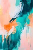 Zachte kleurovergangen van aquatisch blauw naar warm koraal creëren een harmonieuze sfeer. De dynamische penseelstreken en subtiele druppels geven het werk levendigheid. Perfect in een woonkamer, waar het gesprekken stimuleert en een ontspannen sfeer creëert. Een kunstwerk dat uitnodigt om te dromen en te blijven hangen.