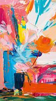 Dit kunstwerk is een levendige en expressieve abstracte schildering die de dynamiek en schoonheid van bloemen vangt in een explosie van kleur en vorm. De compositie bestaat uit felle tinten zoals roze, oranje, blauw, groen en geel, die met krachtige en spontane penseelstreken op het doek zijn aangebracht. De textuur van de verf is dik…