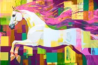 Een majestueus paard dat dynamisch galoppeert door een caleidoscopisch kleurenspel in levendige tinten geel en groen trekt ieders aandacht. De levendige manen in roze en paars voegen een vleugje magie toe aan het kunstwerk. Ideaal voor de woonkamer, het brengt energie en een vleugje fantasie in elke kamer.