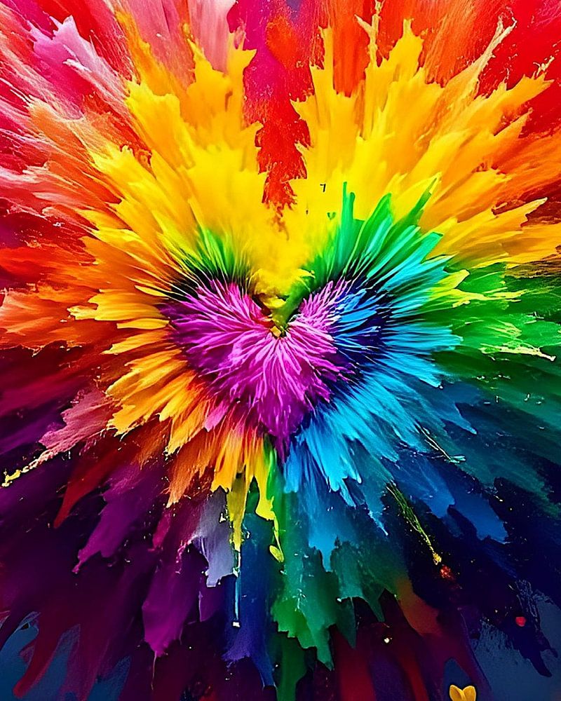 In dit levendige beeld ontvouwt zich een adembenemende explosie van kleuren in de vorm van een hart, dat onmiddellijk de aandacht trekt en de zintuigen aanspreekt. De levendige kleuren - van felrood en warm oranje tot rustgevend blauw en levendig paars - dansen in harmonieuze golven en versmelten tot een spectaculaire caleidoscoop. Deze dynamische compositie straalt een gevoel van energie en passie uit, terwijl de kleuren in zachte overgangen in elkaar overvloeien en het hart als centraal motief omlijsten.