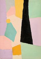 Een abstract schilderij toont pastelroze, mintgroene en zwarte vormen met een grote gele cirkel in het midden. De achtergrond is lichtpaars. Bovenaan is een oversized donkerbruine vorm.