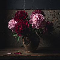 Dit digitale schilderij laat de dramatische elegantie van klassieke kunst herleven door een hedendaagse lens. Diepe, fluweelachtige bordeauxrode en mauve pioenrozen komen tevoorschijn uit diepe schaduwen in een zware keramische schaal met textuur. Het intense contrast dat bereikt wordt door clair-obscur verlichting geeft de scène een…
