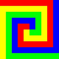 Spiraalvormige permutatie met rood, groen, blauw en geel.