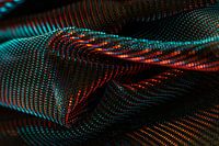 Dit werk toont een abstracte close-up van een fijn gestructureerde stof met een complex patroon van rode en blauwe elementen. Het oppervlak verandert afhankelijk van de lichtinval en wordt sculpturaal gemodelleerd door plooien en lichtverlopen. Gekleurde cirkels van licht worden gecreëerd in de zacht getekende gebieden van het beeld door gerichte scherptediepte - een fotografisch stijlmiddel dat bekend staat als bokeh. Het wordt hier niet gebruikt om een motief af te beelden, maar om het terug te brengen tot licht, kleur en structuur.