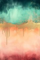 Een hedendaags abstract kunstwerk waarin turquoise en koraalroze tinten harmonieus samenvloeien, gescheiden door een gouden horizon met sierlijke druppels. De zachte kleurovergang creëert een dromerige sfeer, terwijl de metallic gouden accenten voor een luxueuze touch zorgen. Het werk straalt zowel rust als dynamiek uit door het…