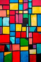 Er ontvouwt zich een fascinerend mozaïek van levendige kleuren, terwijl geometrische vormen in sterk contrast met elkaar dansen. Het krachtige rood omarmt het zachte blauw, terwijl de gele en groene vlakken voor een vleugje dynamiek zorgen. Een harmonieus samenspel van licht en schaduw dat de kijker meeneemt naar een wereld vol emotie en energie.