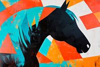 Een krachtig zwart paardenhoofd omringd door levendige geometrische vormen in oranje en turquoise straalt energie en dynamiek uit. Deze boeiende combinatie van kleuren en patronen brengt een modern, artistiek accent in elke woonkamer. Ideaal om een gesprek op gang te brengen en een creatieve sfeer te creëren.