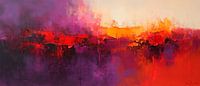 Vurige rode tinten versmelten met zachte violette nuances en creëren een dynamische stemming die zowel energie als rust uitstraalt. De zachte overgangen en intense kleuren roepen emoties en verbeelding op. Dit kunstwerk vindt zijn ideale plaats in de woonkamer, waar het gesprekken stimuleert en creatieve inspiratie aanmoedigt.