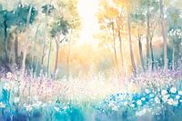Een harmonieuze lichtvloed brengt een betoverend boslandschap tot leven. Zachte pastelkleuren worden gecombineerd met bloeiende wilde bloemen en glinsterende bomen om een vredige sfeer te creëren. Dit kunstwerk past perfect in een slaapkamer, waar het rust en transformatie bevordert.