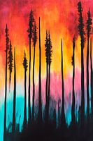 Op de achtergrond ontvouwt zich een vuurwerk van kleuren, terwijl zwarte silhouetten van torenhoge bomen de scène domineren. De levendige mix van sinaasappels, roze en aquablauw straalt een magische sfeer uit die perfect past in een moderne woonkamer en fantasie en gezelligheid combineert.