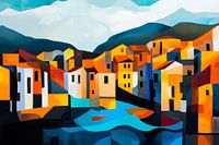 Geometrische huizen rijzen uit boven het glinsterende water in een harmonieus spel van warme gele en oranje tinten. De glooiende heuvels op de achtergrond omlijsten de scène, terwijl een hemels blauw de lucht siert. Deze levendige compositie vat de essentie van een pittoresk dorpje aan zee, waar kleuren en vormen in perfecte symbiose in elkaar overvloeien.