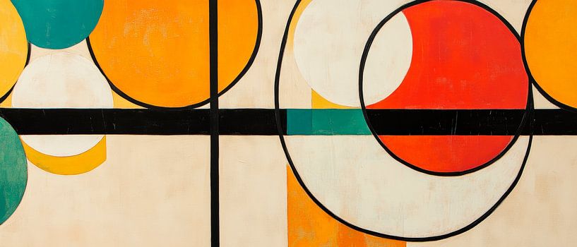 Een spannend samenspel van geometrische vormen en levendige kleuren voert de kijker mee naar een moderne wereld vol creativiteit. De harmonieuze opstelling van cirkels en lijnen straalt frisheid en energie uit, ideaal voor de woonkamer, waar het gesprekken stimuleert en een inspirerende sfeer creëert.