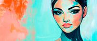 Een fascinerend portret dat de essentie van een zelfbewuste vrouw vastlegt met levendige kleuren en zachte penseelstreken. De harmonieuze combinatie van zacht turquoise en koraalkleurige accenten geeft de kamer een moderne uitstraling. Ideaal voor een woonkamer of creatief kantoor waar inspiratie en stijl hand in hand gaan.