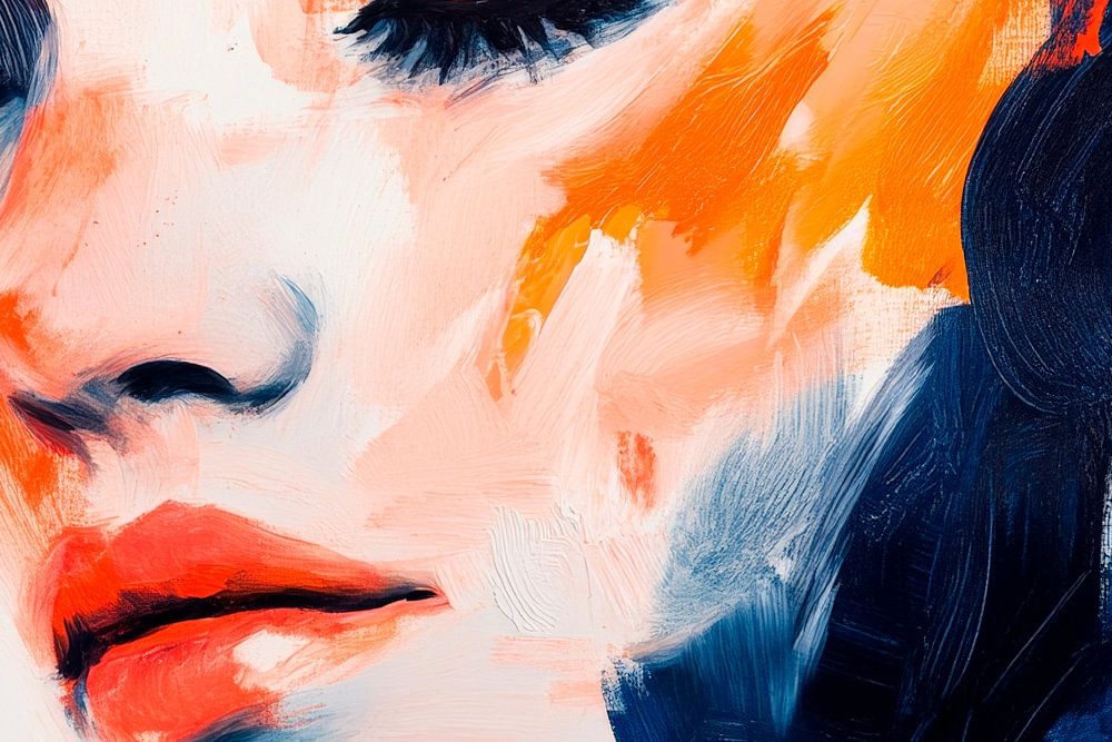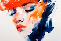 Een levendig samenspel van levendige kleuren brengt een expressieve portretinterpretatie tot leven. De harmonieuze samensmelting van rood en blauw benadrukt de zachte gelaatstrekken en innerlijke rust van het gezicht. Dit artistieke meesterwerk zou perfect passen in een moderne woonkamer, waar het gesprekken kan stimuleren en emoties kan oproepen.